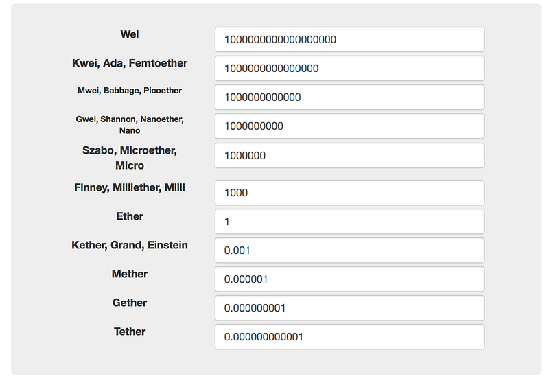 Az Ether legkisebb egysége a wei. Ez ugye azt jelenti, hogy wei-ből csak egész számú létezhet, nincs olyan, hogy 0.5 wei. Mivel az Ethereum rendszer szinten egész számokkal dolgozik, ezért valójában mindent wei-ben számol. Aki esetleg használta már a web3 API-t, vagy foglalkozott Solidity programozással, az nagyon jól tudja ezt.