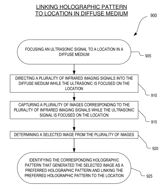 The system also includes an ultrasound emitter (115), which helps in focusing the light. With focused ultrasound, the frequency of the light passing through a given area can be altered, thus “tagging” the light beams. With this technology, the information originating from the observed area can be selected. Therefore, with the help of focused ultrasound, we can find the holographic pattern that is most suitable for observing the given area. Once the necessary pattern is found, the system can operate without ultrasound. The following figure shows this process: