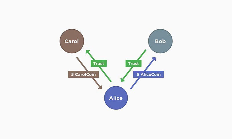 This model shines when more people are involved. Imagine a third person, Carol, enters the picture. Alice doesn’t know Carol and therefore doesn’t trust her currency. But if Bob trusts Carol and Alice trusts Bob, then the network bridges that trust gap. Carol can swap her CRCs for Bob’s, and then use Bob’s CRCs to pay Alice, for instance, for a haircut. The system handles these indirect trust paths seamlessly in the background, so to Carol, the transaction still feels like a direct payment to Alice.