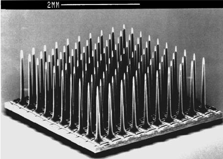 The roots of this field stretch back decades. One of the earliest and most influential devices was the Utah Array — a tiny, four-millimeter square grid holding a hundred microscopic electrodes, resembling a miniature bed of nails. Implanted directly into brain tissue, it can record the electrical signals produced by neurons and relay them to an external computer for interpretation.